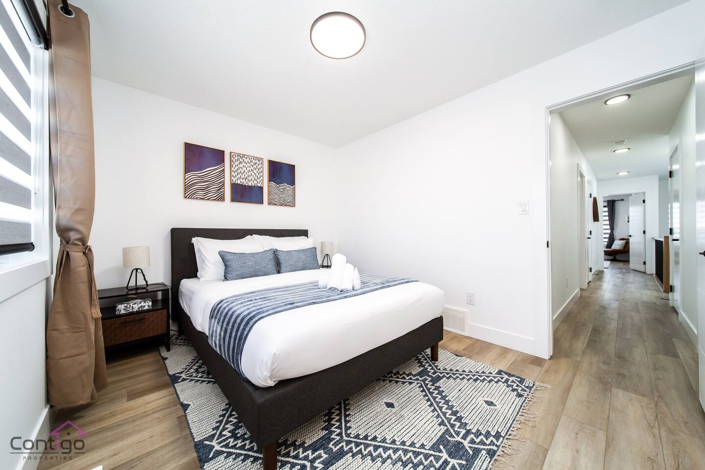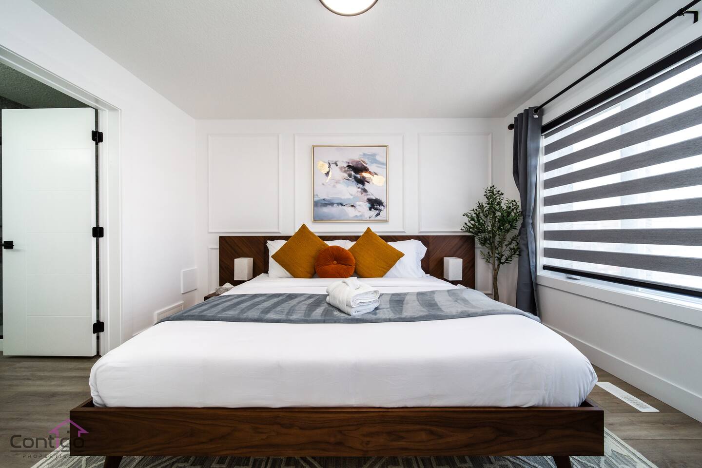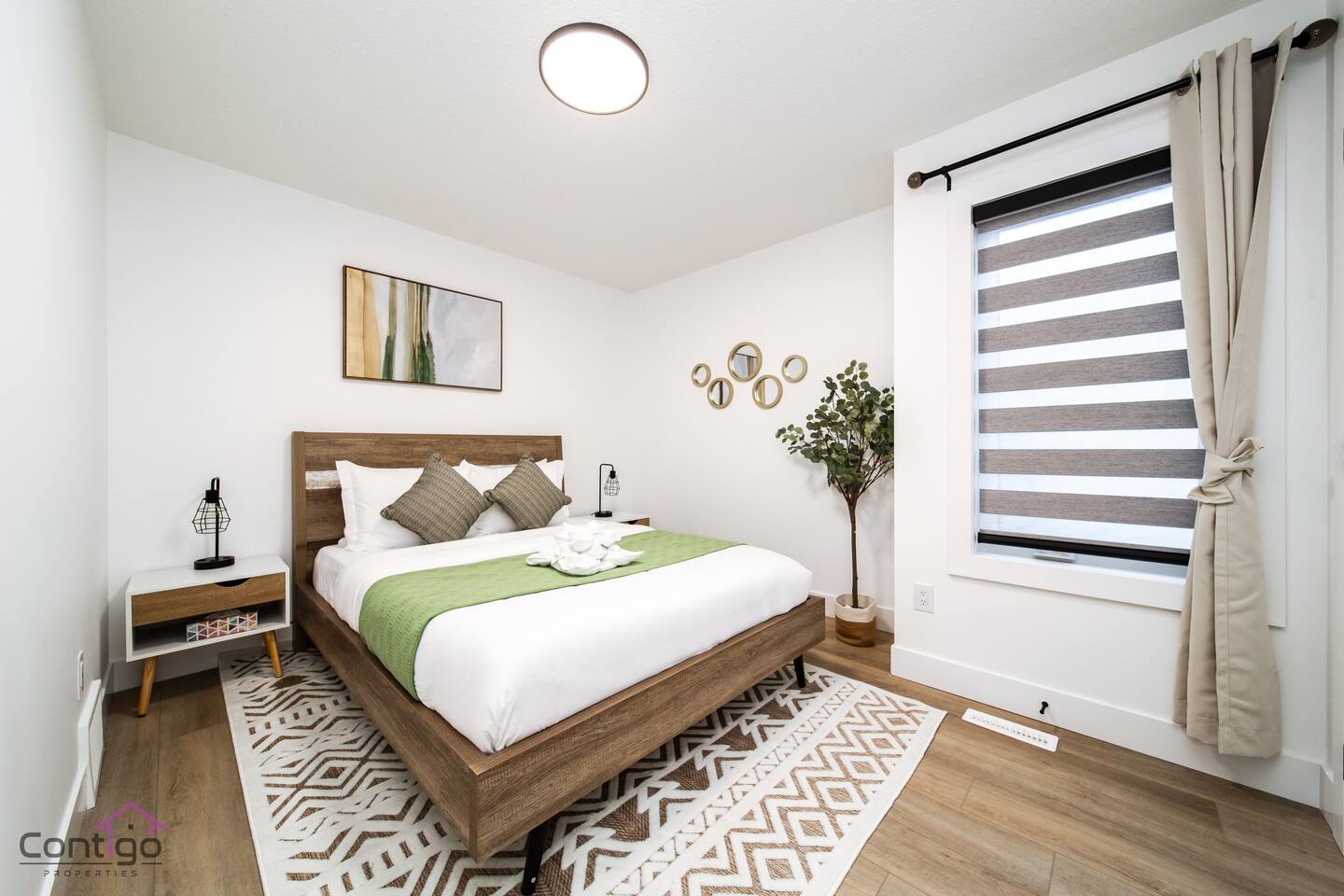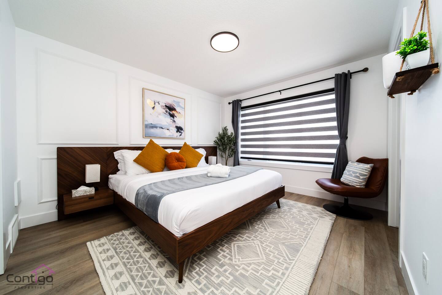 **This is the Main Floor of the home only; the basement is a separate listing** Welcome to your private and stylish retreat in the heart of Edmonton! This listing is for the entire main floor of a brand-new home, offering you a spacious, self-contained 3-bedroom, 2.5-bathroom sanctuary. You are just minutes from Downtown, the University of Alberta, and West Edmonton Mall, making it the perfect home base for exploring the city. ✦ Relax in the inviting living area, where you can stream your favourite shows on the Roku Smart TV (Netflix-ready, just use your own account) or catch up on work with our lightning-fast WiFi. ✦ The fully-equipped kitchen is great to cook in, featuring brand-new stainless steel appliances and all the cookware, dishes, and cutlery you'll need. We've also stocked complimentary coffee and tea to get your mornings started. When it's time to rest, you'll find three comfortable bedrooms: - Master Bedroom: 1 King Bed with ensuite bathroom - Bedroom 2: 1 Queen Bed - Bedroom 3: 1 Queen Bed ✦ All beds are fitted with fresh, clean linens for a restful night's sleep. The 2.5 sparkling clean bathrooms are stocked with complimentary soap, shampoo, and body wash for your convenience. ✦ HIGHLIGHTS & AMENITIES ✦ - Central Location: Reach any part of the city within minutes. - Modern Comfort: Beautifully decorated with simple, modern furnishings for a warm ambiance. - Outdoor Space: Enjoy your morning coffee on the private patio. - Peaceful & Private: Located in a quiet, safe neighbourhood. - Easy Check-In: Seamless self-check-in with a secure door keypad. - Family & Work Ready: Perfect for staycations, family visits, or remote work. ✦ NEED MORE SPACE? ✦ This home contains a completely separate basement suite with its own private entrance. If travelling with a larger group, you can book the "The Zen Den" suite, which sleeps an additional 4 guests. Please check our host profile to see if it's available for your dates. We've put our hearts into creating a space that feels like your own modern, comfortable home. We can't wait to host you!
